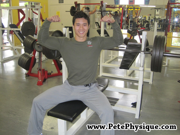 Today I did my Intermediate Upper Body Routine that’s in my Pete Physique fitness book. I was lifting some serious weight on the bench press exercise, but it didn’t feel right. That’s when I realized that the guy I asked to spot me was lifting some of the weight himself. I’m sure he was trying to be a nice guy, but he totally messed up my set. I need to feel the entire weight when I’m lifting and I always force one last rep out, to tear more muscle fibers which increases my strength. If I’m not able to complete the additional rep, I land the bar on the safety pins. I guess my point is, if you ever spot someone, let them lift the weight, just help out if needed.