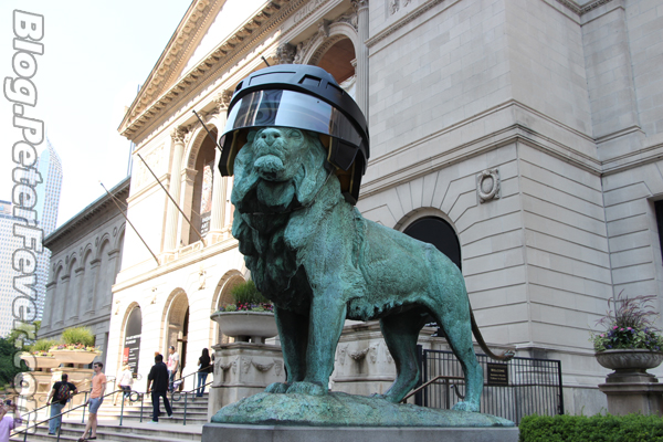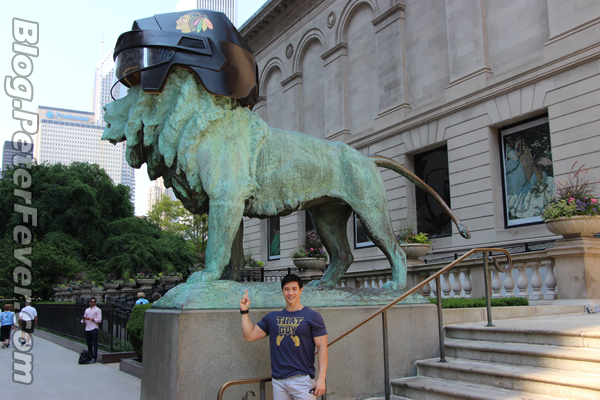 Yep, Chicago’s Pride in hockey! What else were you thinking. Chicago takes pride in our hockey team, the Blackhawks. They are in the hunt for the Stanley Cup Championship and during all their games, all the bars in Chicago are packed with diehard fans. I was out doing some photography and I happen to pass by two lion status with Blackhawk helmets that represents the pride of Chicago in its team sports. Go Blackhawks!
