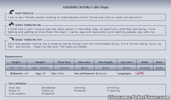 Tonight on LiveCams I chatted with xASIANFLAVORx, a guy who has one of the most charming smiles I’ve ever seen. He’s a nice change from the muscle men I usually look at. For some reason, I could picture him standing in front of me at a coffee shop while waiting for my morning cup of joe or someone I could see browsing through the men’s section of a clothing store. He was just a real genuine person to me, someone I could meet in my neighborhood. What I liked about him even more was his confidence. Not a shy bone in his body, just a hard one ;). We took our chat to another level. He took off his shirt, his pants, then his undies, and all he had on left was that smile.