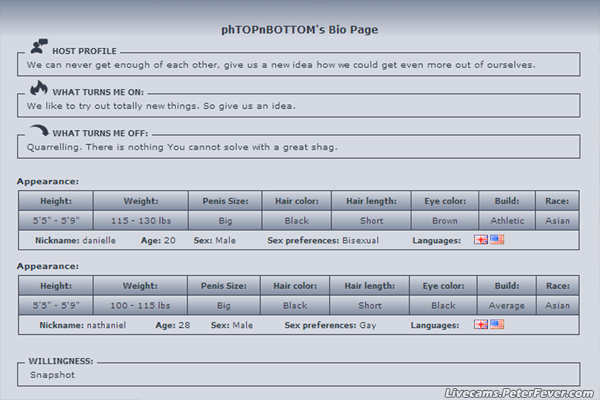 I thought one Asian on LiveCams was fun, well I wasn’t ready for double the trouble when I met phTOPnBOTTOM. These boys loved to flirt with each other and were feeling up on each other’s body. When they asked me to join, my threesome fantasies came to life.