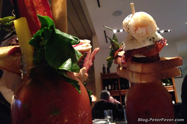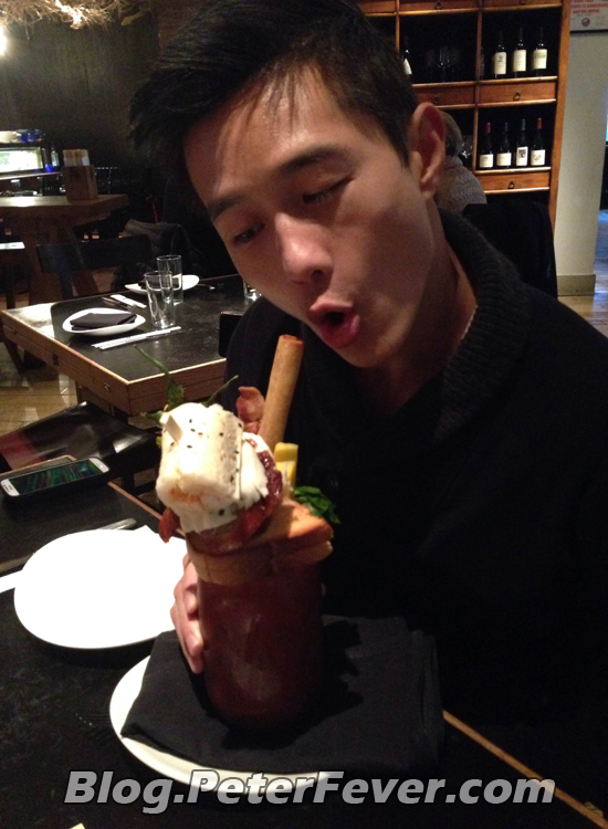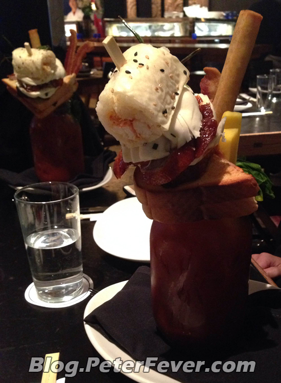 My buddies and I heard of a giant Sumo served at our favorite local sushi restaurant. For brunch, you have to ask for the sumo which is one of their secret drinks, it’s not on the regular menu. So what’s in it? It’s a 32 ounce jar filled to the brim with a Bloody Mary, topped with the following craziness: a Chinese sausage grilled cheese sandwich, a duck bao bun, three strips of bacon, pork belly, bok choy, daikon, potatoes, Japanese peppers, lumpia, and a piece of crab sushi roll! They even bring you a plate on the side for all that food. It was a tough battle, but in the end I’m proud to report that we all conquered the sumo!