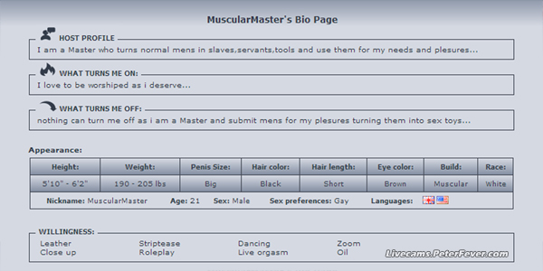 I had the most sexual experience tonight. Usually I’m in command when I’m on LiveCams but this time things took an interesting turn when I logged on and started chatting with MuscularMaster. He’s not as naked as you see him in the pictures. He was fully clothed and I wanted to see more, but he wasn’t going to take it off so easy. For each article of clothing I wanted off, I had to do a sex act to try to get him turned on. First I had started fingering my nipples and then I moved on to finger my hole. When he finally took off his clothes, he didn’t have to ask me to jerk off, he was fucking hot, I already couldn’t resist. I was indeed his obedient servant.