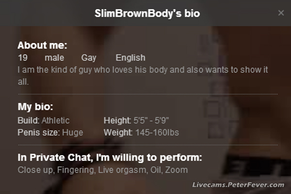 I chatted with SlimBrownBody last night on LiveCams. When he stood up to show off his body he was anything but slim. Before we even got to private chat he was flaunting his stiff cock bouncing it around in his underwear. I watched him dance, thrust, and stroke his cock. I couldn’t resist seeing more. He only got sexier in private chat showing off everything to me. I’ll be back for round two soon.
