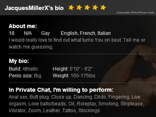 I was on LiveCams tonight with JacquesMillerX and I love meeting guys from different cultures. I got curious from reading his bio and I definitely wanted to play a guessing game with him. It’s nice when a guy tries so hard to turn you on. He was giving me the best show of my life cause I never expected what he would do next. I can’t wait to see him again on LiveCams.