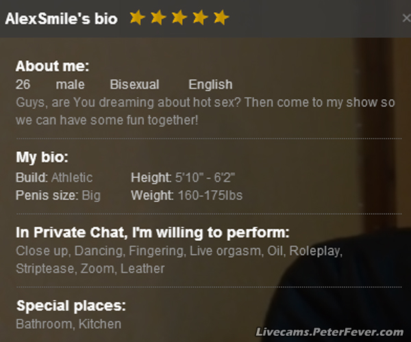 Today you are in for a treat. AlexSmile is on LiveCams and this boy lives up to his name. If his pearly whites don’t charm you his huge cock will certainly grab your attention. Chat with him for free and see what this guy has to offer in his private sessions.