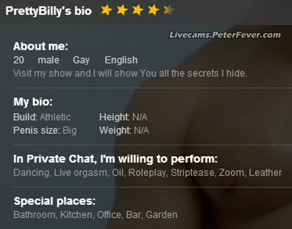 We have PrettyBilly on LiveCams tonight. This young guy is ready to strip and dance for you and show the world his big secret. Watch him oil up and unleash his naughty side but before you do that, take a chance to know him in the free chat session before going into the private rooms.