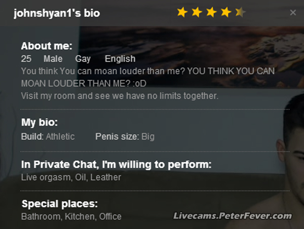 I scoured the PeterFever LiveCam database for this gem tonight, johnshyvan1. Don’t be fooled by his handsome charm, he is an sexual demanding and will give a fun time. If you like sex talk, this rugged guy will spend a lot of time with you and he is definitely a loud and verbal one.