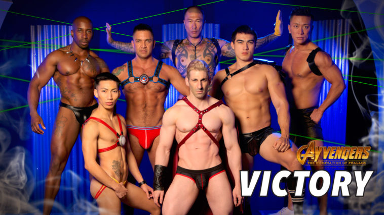 “Now let’s fuck,” Phallos commands, and the horny Gayvengers provide not a whimper of resistance. T’Balla plows his massive ebony rod into Thor’s pale pink ass. Phallos fucks and fingers his minion and sex-crazed Tony, who winds up as the middle of a scorching hot spitroast between Phallos and T’Balla. American Hero and Bucky push their prey, Minion and Thor down to the platform and ream their asses with superhuman fury. Bodies tangle and writhe in hot sexual abandon, and the temperature heats up to the ball-boiling point.