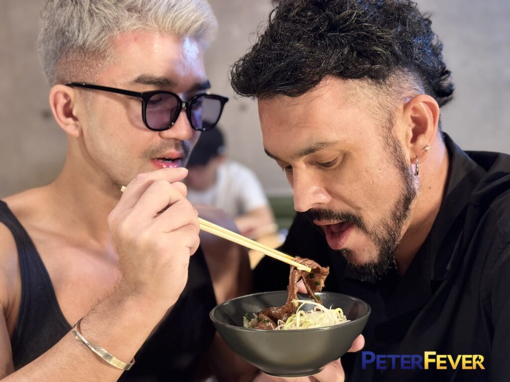 Here we watch sexy silver-haired Daniel Zhang being served a steaming bowl of fresh beef udon as hot Japanese mixed guy Kenji takes a seat next to him at the counter. After cooling off on this hot summer Tokyo night with a cool, refreshing wet towel, he notices Daniel slurping down the delicious noodle soup. Daniel mentions “It’s delicious. I highly recommend it,” encouraging the conversation. Kenji notices the hot muscular beef of Daniel’s biceps as he gets offered a taste of udon. He orders “the same” as they toast their meeting. They agree to go somewhere to discuss working out after they finish eating. Kenji shows no interest in waiting, and takes his steaming bowl “to go”.